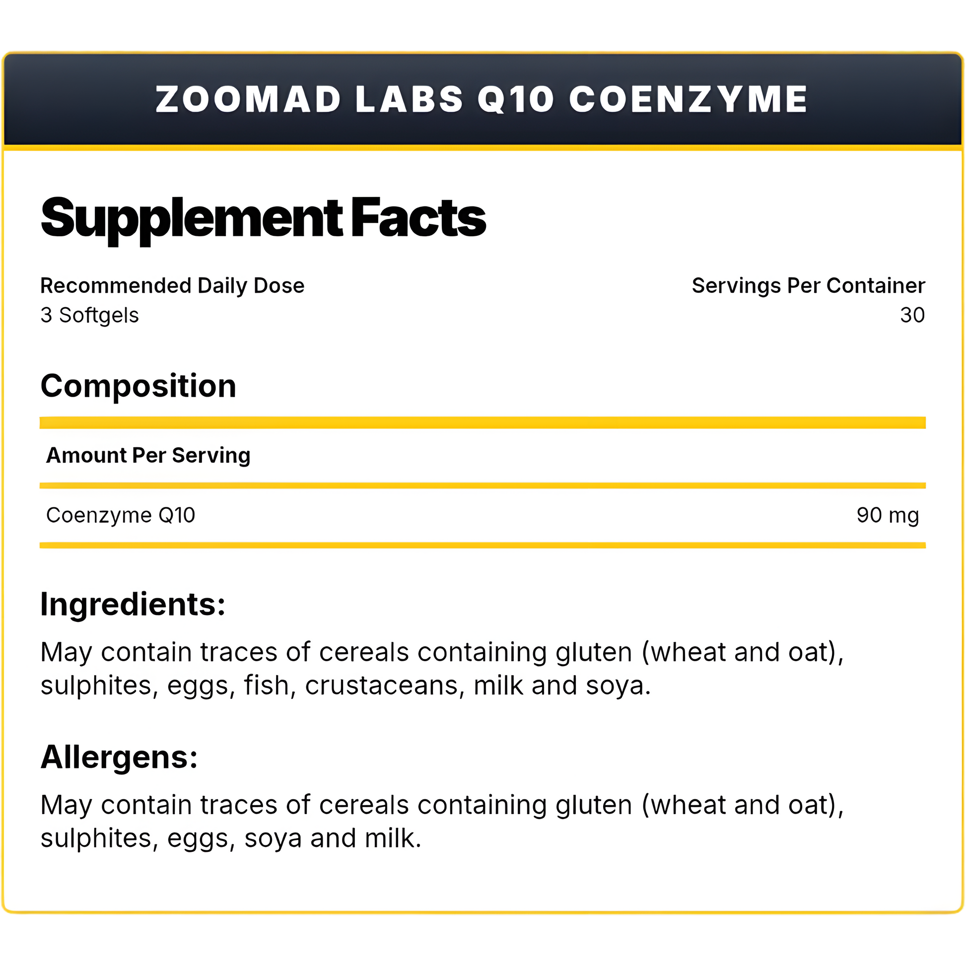 Zoomad Labs Q10 Coenzyme is a high-quality food supplement designed to support your overall health and wellness. Each serving provides a potent dose of Coenzyme Q10, a vital compound that plays a key role in energy production and antioxidant protection. This supplement is perfect for adults looking to support their cellular energy and protect their body from oxidative stress.