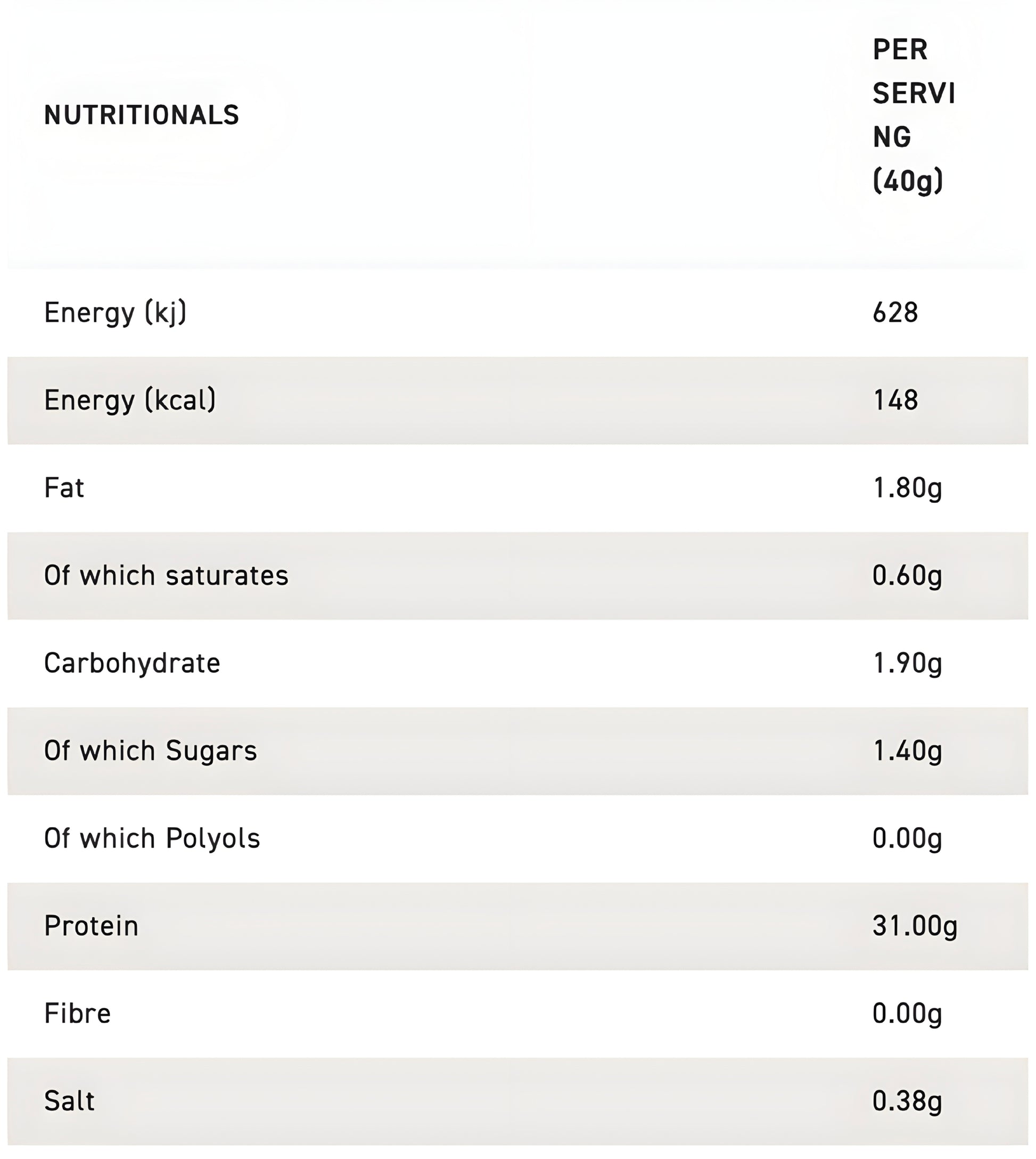 Full Serving (30g Protein): Add 2 level scoops of powder (40g) to 250ml of ice-cold water or milk of your choice.